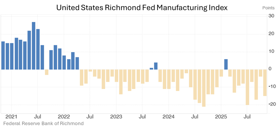 (The Richmond Fed index measures manufacturing conditions across the Fifth Federal Reserve District, where values above zero reflect improving activity and values below zero represent deterioration in output, orders, and employment.)